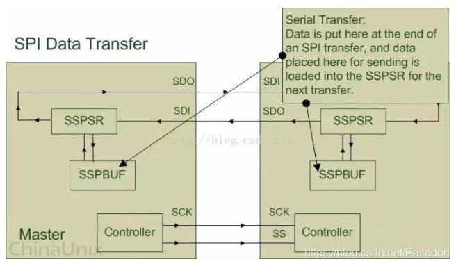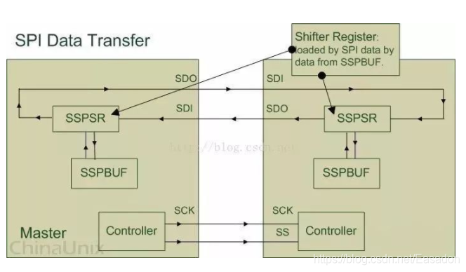 SPI 设备在进行通信的过程中, Master 设备和 Slave 设备之间会产生一个数据链路回环(Data Loop), 就像上图所画的那样, 通过 SDO 和 SDI 管脚, SSPSR 控制数据移入移出 SSPBUF, Controller 确定 SPI 总线的通信模式, SCK 传输时钟信号。