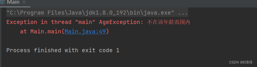 public class Main{ public static void main(String[] args){ int age = 180; if(!(age >= 18 && age <= 120)) { throw new AgeException("不在该年龄范围内"); } System.out.println("你的年龄范围正确。"); } } class AgeException extends RuntimeException{ public AgeException(String message){ super(message); } }