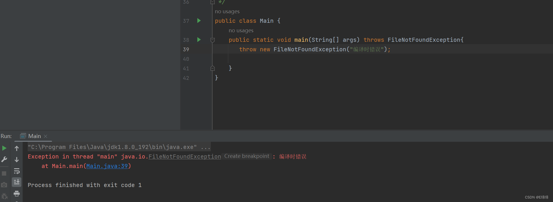 而编译时异常系统并不会自动帮你用throws声明,所以当你不处理该异常时它既没有被try catch捕获又没有被传递到JVM,自然程序运行都运行不了。所以想要运行则必须要处理它。