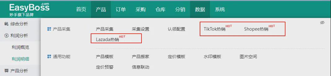 此外,还需要尝试寻找高潜力产品,可借助 EasyBoss的 Shopee/TikTok /Lazada热销功能,分析市场需求,挖掘蓝海产品。