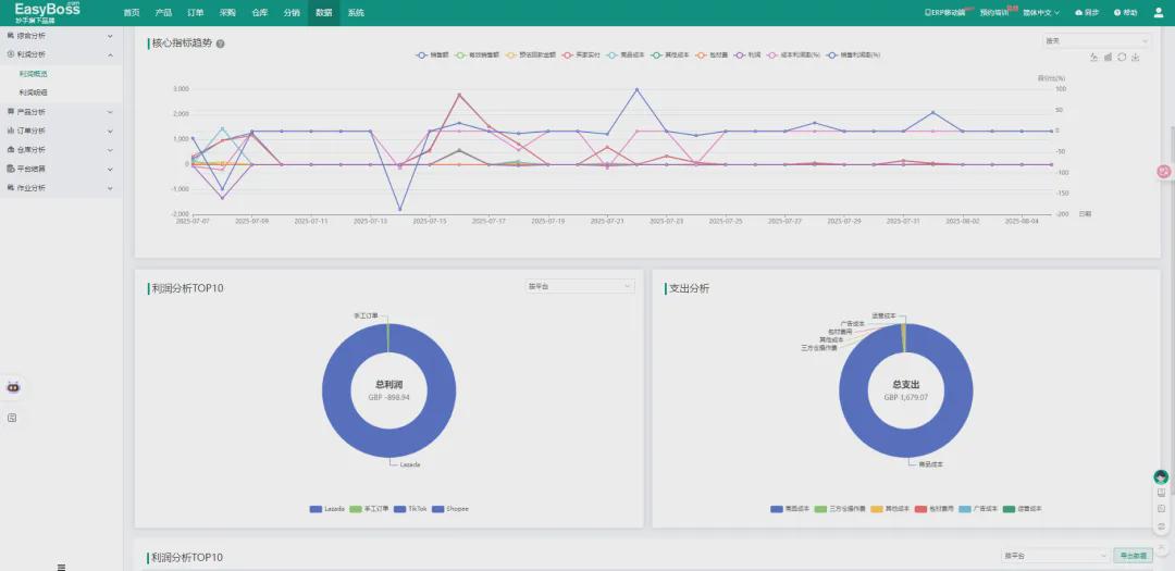 精准掌控成本是把控利润,调整策略的基础,对于卖家来说,应打破“仅关注采购成本”的误区,应全面梳理,打包费、广告投放、运营成本等隐性成本。借助 EasyBoss ERP 的利润概览功能,查看单店/多店各项成本的占比,精准定位可优化环节,替代人工核算,提升效率。