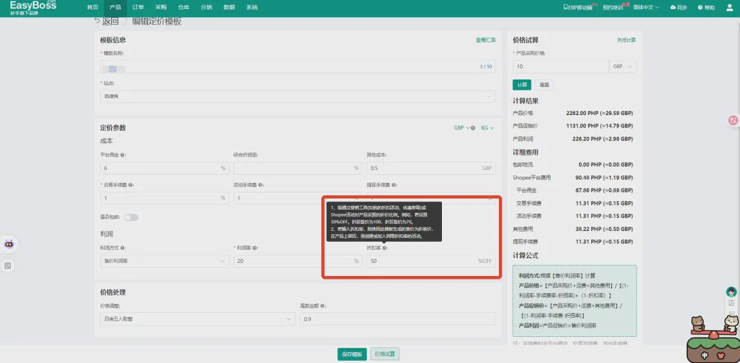 此外,还要及时追踪市场和竞品的价格变动,然后根据自己的日常售价、店铺营销活动与平台活动,进行灵活调整价格。为确保在频繁的活动调价中不亏损,可使用EasyBoss 定价模板,预设活动折扣比例,计算产品折前价,有效避免活动亏损,让调价精准高效。