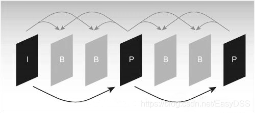 如图所示,I帧只使用本帧内的数据进行编码,在编码过程中它不需要进行运动估计和运动补偿。显然,由于I帧没有消除时间方向的相关性,所以压缩比相对不高。P帧在编码过程中使用一个前面的I帧或P帧作为参考图像进行运动补偿,实际上是对当前图像与参考图像的差值进行编码。B帧的编码方式与P帧相似,惟一不同的地方是在编码过程中它要使用一个前面的I帧或P帧和一个后面的I帧或P帧进行预测。由此可见,每一个P帧的编码需要利用一帧图像作为参考图像,而B帧则需要两帧图像作为参考。相比之下,B帧比P帧拥有更高的压缩比。