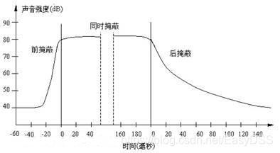 当强音信号和弱音信号同时出现时,还存在时域掩蔽效应。即两者发生时间很接近的时候,也会发生掩蔽效应。时域掩蔽过程曲线如图所示,分为前掩蔽、同时掩蔽和后掩蔽三部分。