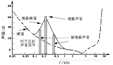 一个频率的声音能量小于某个阈值之后,人耳就会听不到,这个阈值称为最小可闻阈。当有另外能量较大的声音出现的时候,该声音频率附近的阈值会提高很多,即所谓的掩蔽效应。如图所示: