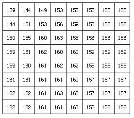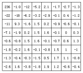 经过分块以后,每个88点的图像块被送入DCT编码器,将88的图像块从空间域变换为频率域。下图给出一个实际8*8的图像块例子,图中的数字代表了每个像素的亮度值。从图上可以看出,在这个图像块中各个像素亮度值比较均匀,特别是相邻像素亮度值变化不是很大,说明图像信号具有很强的相关性。