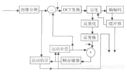 上面介绍了视频压缩编码过程中的几个重要的方法。在实际应用中这几个方法不是分离的,通常将它们结合起来使用以达到最好的压缩效果。下图给出了混合编码(即变换编码+ 运动估计和运动补偿+ 熵编码)的模型。该模型普遍应用于MPEG1,MPEG2,H.264等标准中。