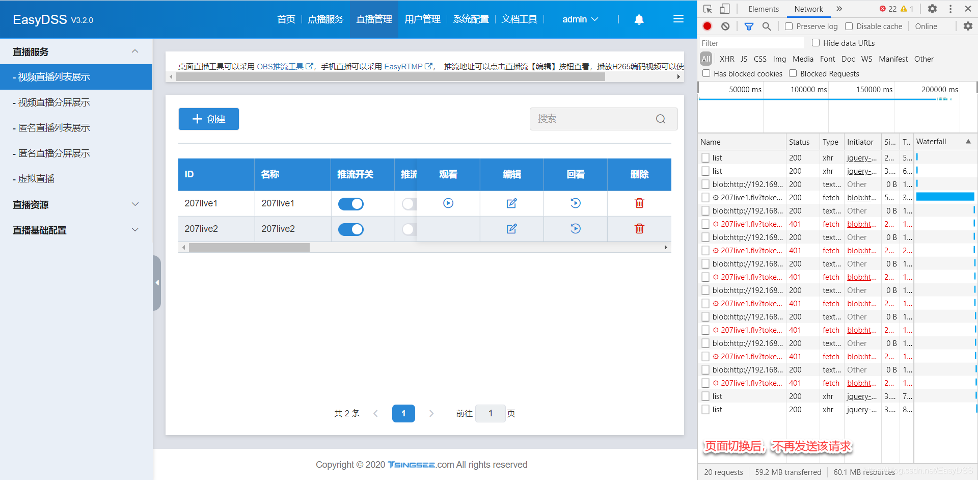 EasyDSS视频推流平台开启演示模式分屏播放超过3分钟后,出现不停发送请求的情况,即使切换页面后仍然在不停的发送该请求。