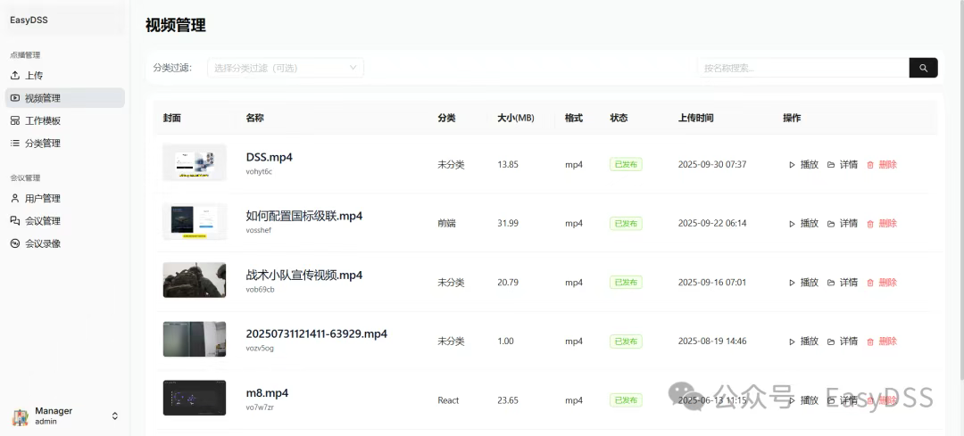 检索效率大提升:支持“分类+名称模糊搜索”双模式,输入关键词或点击“企业培训”、“应急演练”等自定义分类,秒定位目标视频;