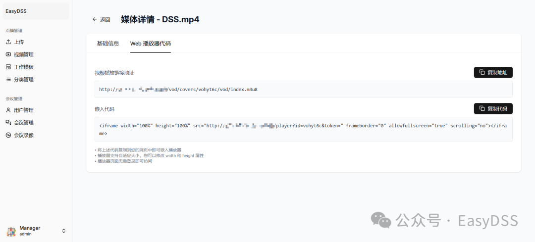 传播零障碍:生成专属播放链接与嵌入代码,可直接嵌入官网或分享至微信,播放器自适应手机、电脑屏幕,且支持免登录观看,外部培训、活动回放分享更便捷。