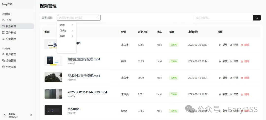 灵活上传+分类管理,打造企业专属知识库:HR或部门负责人可批量上传新员工入职、岗位技能、合规教育等各类培训视频,按“部门”“岗位”“培训主题”自定义分类,比如将“销售话术培训”归入“市场部-技能提升”类目,员工查找时一目了然,避免视频杂乱难寻。