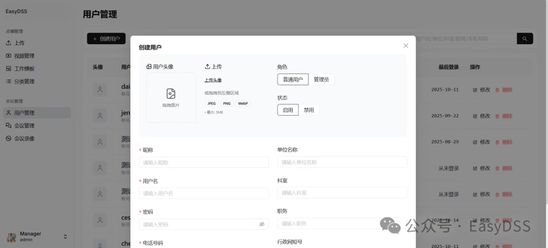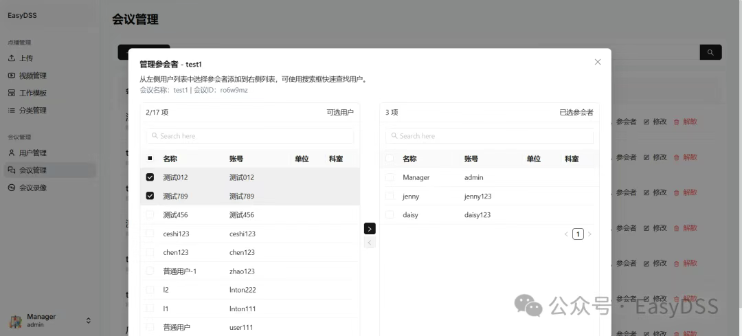 新版EasyDSS给出解法:管理员或项目负责人在平台内,直接从“用户库”勾选需要参会的成员,一键发起视频会议,参会人登录自己的EasyDSS账号就能直接接入。