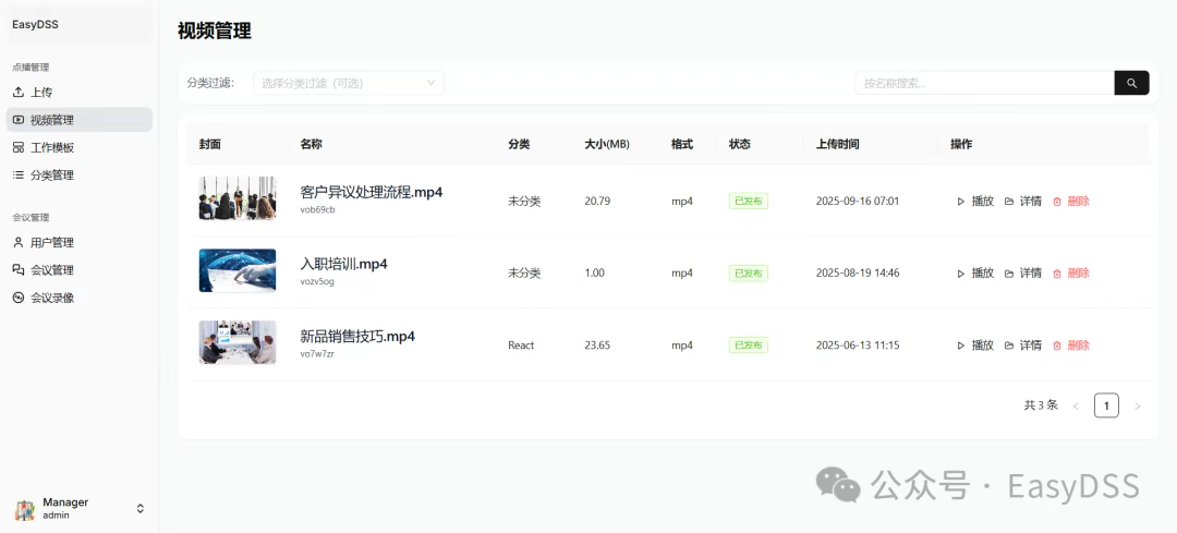 传统的流媒体平台往往功能单一,要么只能做直播,要么只能开会议,系统割裂、体验不佳。EasyDSS实现了直播、点播、会议三大功能的一体化整合,让企业在一个平台内就能满足所有视频需求。