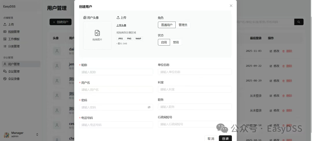 传统会议中,权限混乱常导致信息安全隐患。EasyDSS会议功能采用双角色权限设计,支持管理员与普通用户两种角色,权限清晰划分。