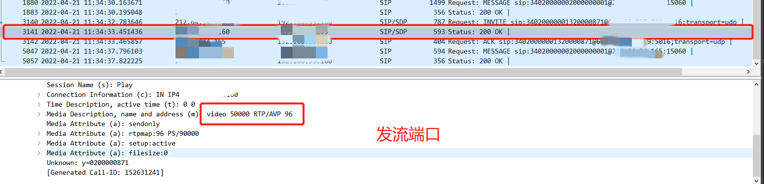 通过用户描述,该用户将EasyGBS作为下级平台,级联到上级平台(宇视平台),上级平台无法播放视频。我们在排查中经过抓包发现,EasyGBS平台向上级发送了视频流数据,但是上级平台却无法播放。深入排查得知,上级宇视平台在回复SIP/SDP 200 OK消息中,发流端口和实际发流端口不匹配,如下图: