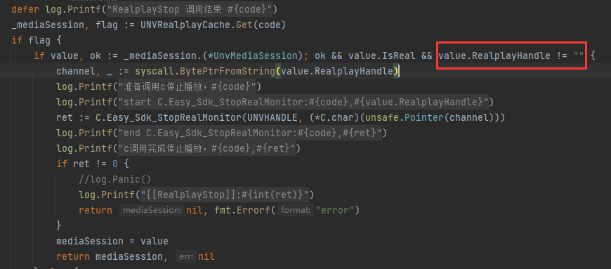 技术人员收到反馈后立即开展排查分析。首先查看日志,在查看日志时出现以下的日志信息。开始播放流未完成,就立刻停止播放此句柄。导致找不到停止的句柄,随后go层也删除掉了保存在本地的缓存信息。