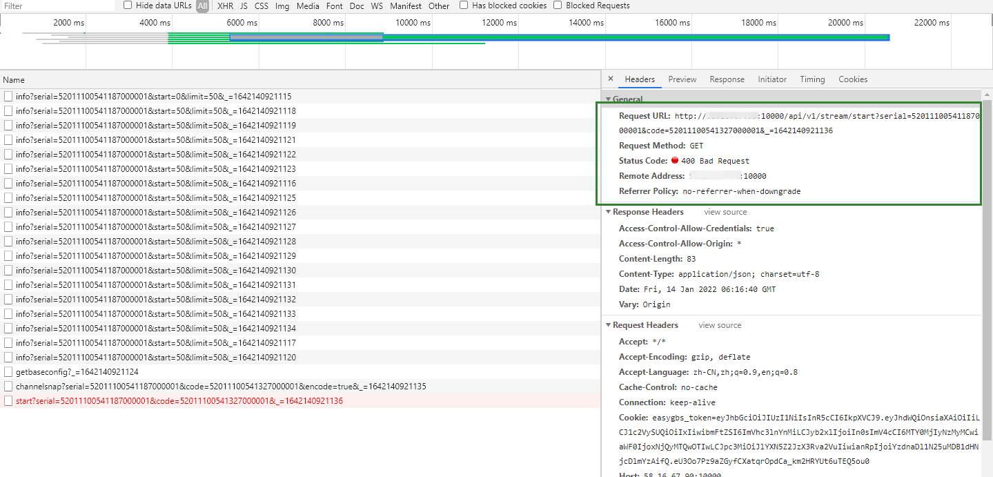 有用户反馈,在现场部署EasyGBS后,通道显示在线,但是视频无法播放,并提示400错误,但是设备端播放正常,请求我们排查协助。