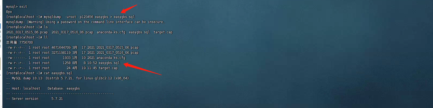 3)确定好数据库后,使用mysqldump命令将整个数据库进行备份,以sql的形式展示,即可完成数据库的备份了。