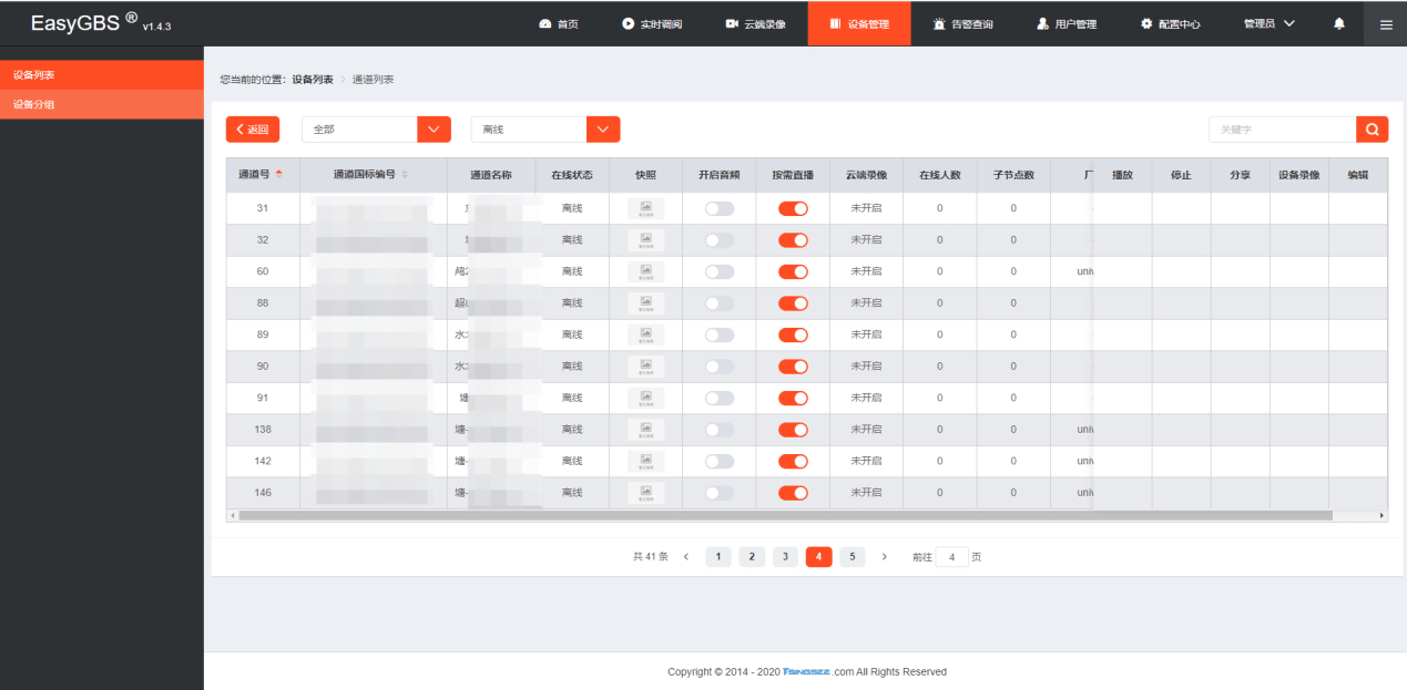 有用户反馈,EasyGBS设备正常注册,但是通道显示离线状态,如下图: