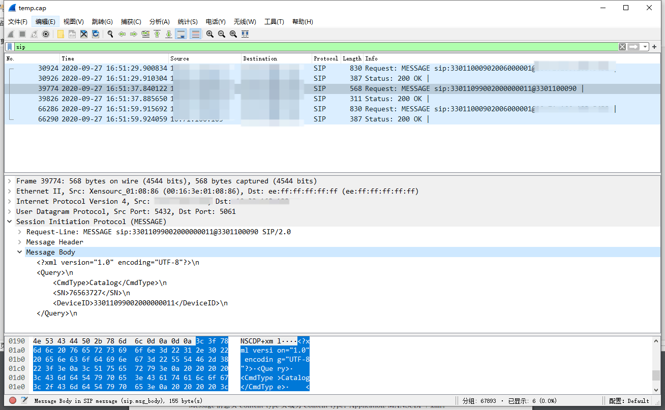 3、随后通过现场服务器抓包数据分析,确定是EasyGBS平台发送了查询指令,但是下级平台没有回复;