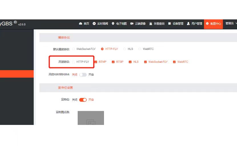 3)查看web页面配置,发现用户选择了默认使用HTTP-FLV协议播放,但并没有开启HTTP-FLV协议;