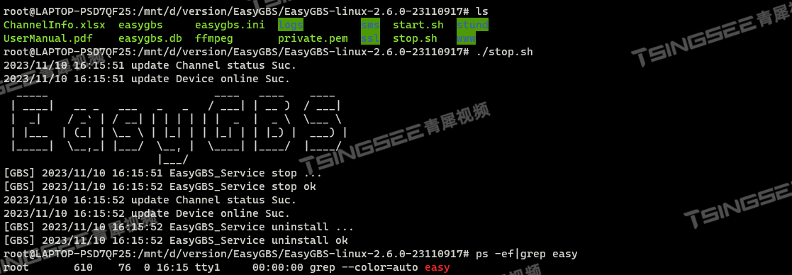 1、首先进入EasyGBS安装目录,执行stop.sh,完成后ps确认是否还有相关进程存留,以下状态即为卸载完成: