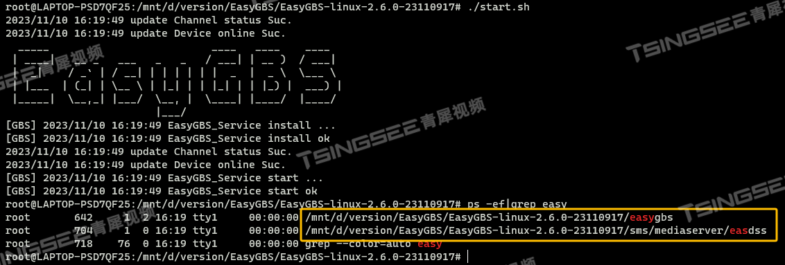 3、解压后,执行start.sh,完成后ps确认EasyGBS进程,如下即可: