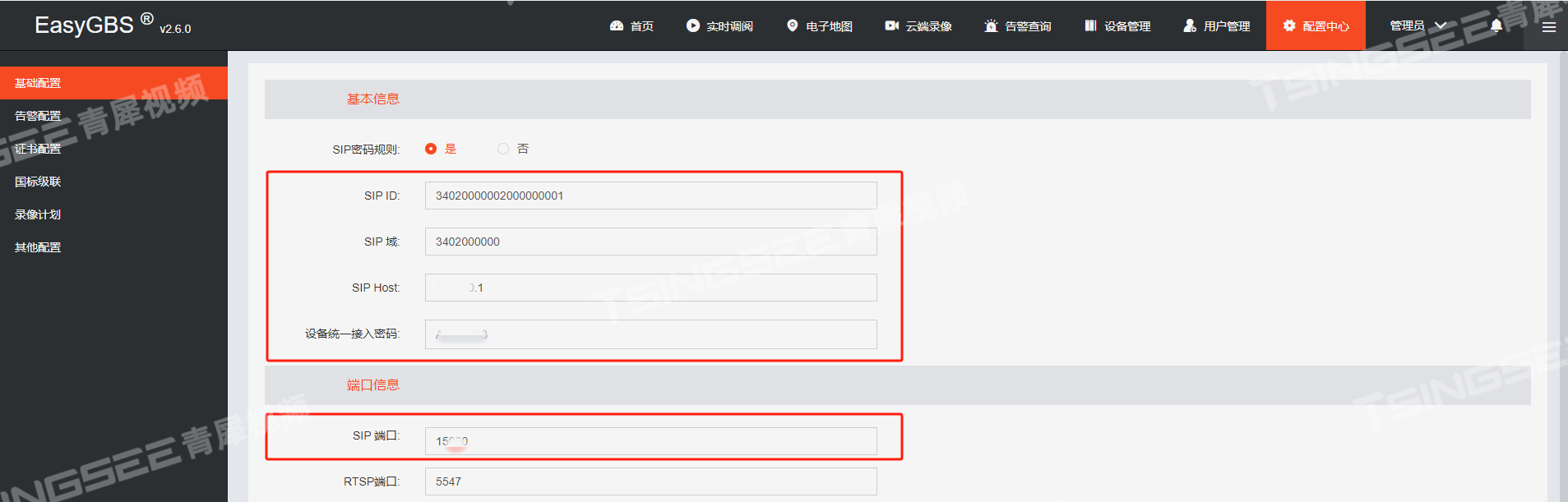 4、GB28181协议,前端设备依据EasyGBS平台的SIP信息、服务器IP、SIP端口和密码接入,如果某项有改动,可在平台【配置中心】-【基础配置】里修改,并在前端设备同步。