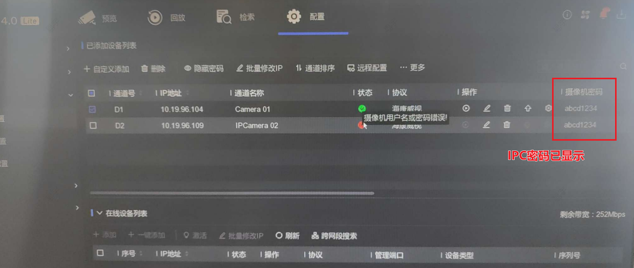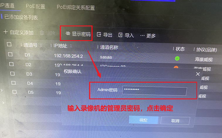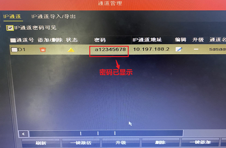 进入通道管理-通道配置-IP 通道,IP 通道密码可见,输入录像机密码即可显示摄像机密码。