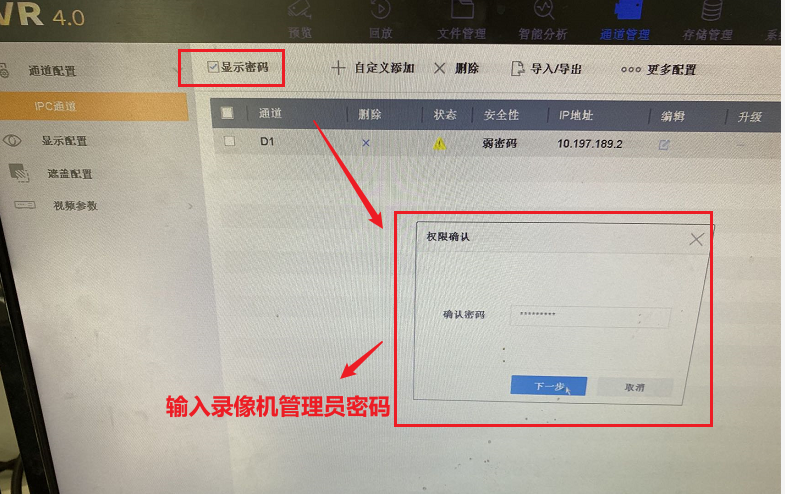 进入通道管理-通道配置-IPC 通道,点击显示密码,输入录像机密码即可显示摄像机密码。