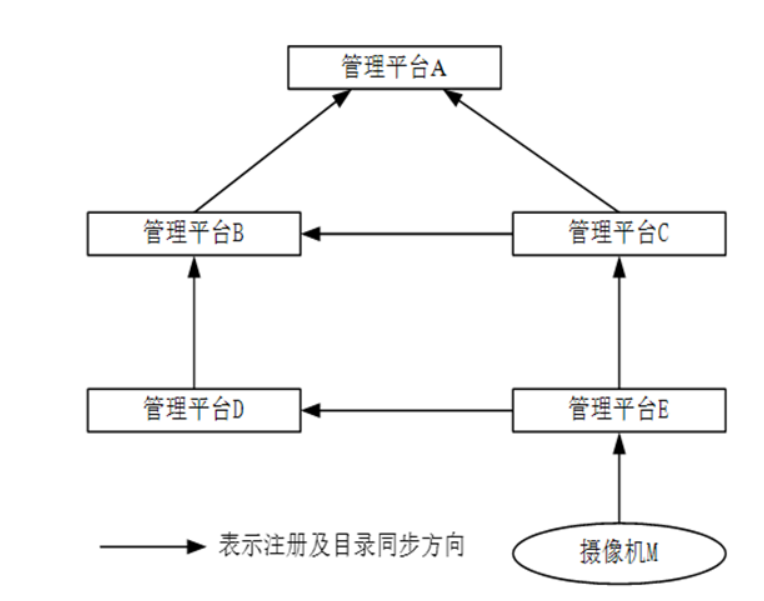 在视频联网平台发展过程中,由于业务流程和网络拓扑越来越复杂,联网结构逐渐从树状结构发展成网状结构,下级平台可能会有多个上级平台或者互联平台,同一目录可能会被推送到多个不同的平台,而这些平台又可能再往上推送到同一个更上级的平台,从而形成了多个路径。一个多路径的例子如图3所示,这种联网结构中,上级域访问下级域接入的目标设备,存在多种访问路径的可能性。图中平台A访问设备M,则存在C→E、B→C→E、B→D→E三种路径。
