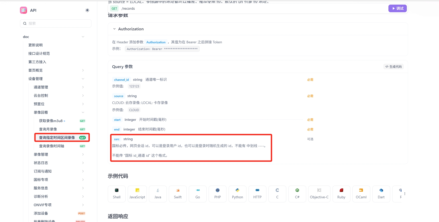 从客户的这张图片里面看很明显能看出来设备是国标协议接入的,而我们的接口文档里对国标设备的指定时间录像查询是明确必须要传 SSRC 的,如下图: