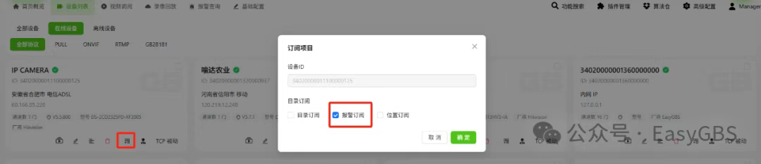 1、先打开【设备列表】,把设备的 “报警订阅” 给开了,这步可别落下;