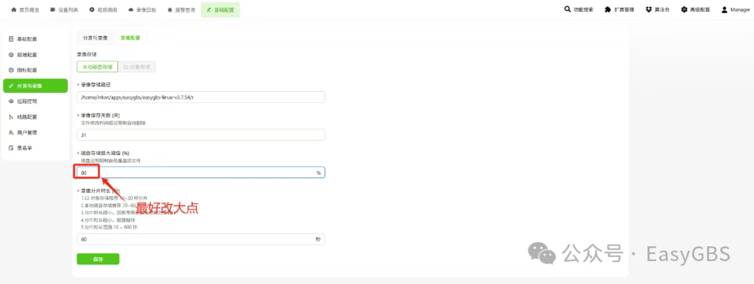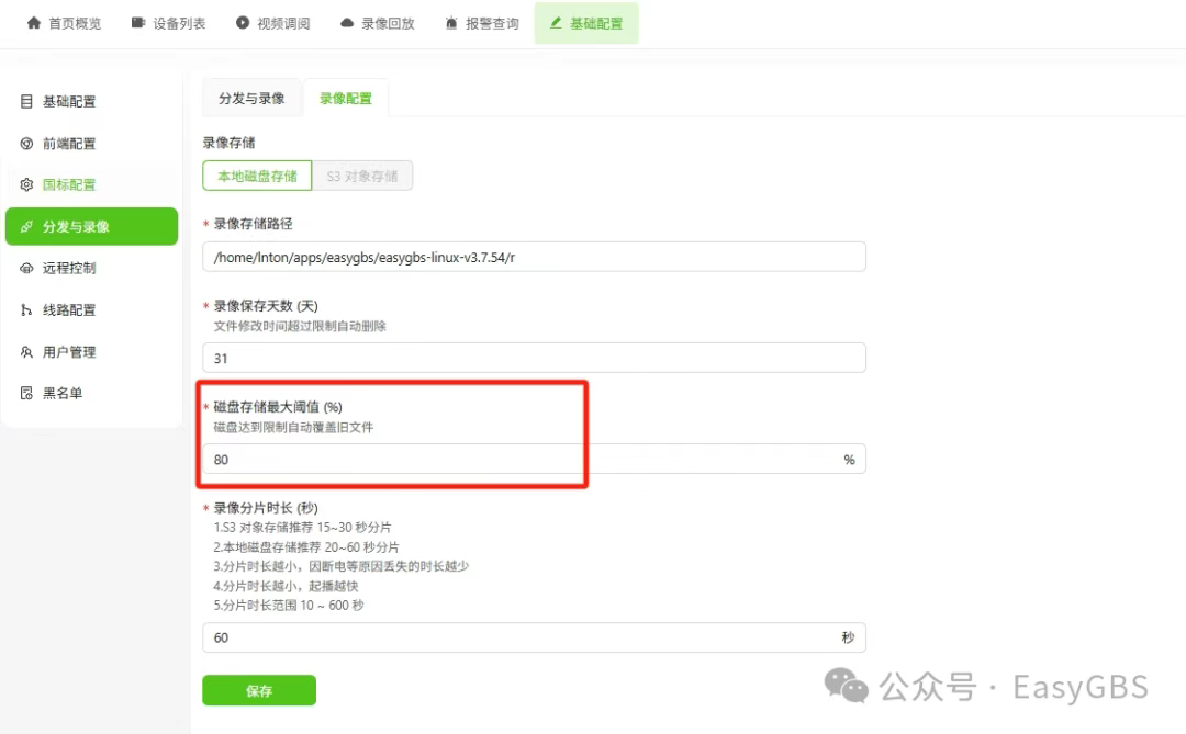 要是你在EasyGBS上设好了录像计划,结果没录上,听我的,你赶紧去这地方看看!先点【基础配置】,再找【分发与录像】,然后进【录像配置】页面,里面有个“磁盘存储最大阈值(%)”,把那数字往大调调,按你自己的需求改就行,改完大概率就没问题了。