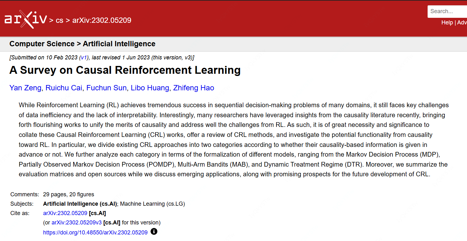 摘要:虽然强化学习(RL)在许多领域的序贯决策问题中取得了巨大成功,但它仍然面临数据效率低下和缺乏可解释性的关键挑战。有趣的是,最近许多研究人员借鉴了因果关系领域的见解,催生了大量将因果关系的优点相结合的研究工作,很好地解决了强化学习面临的挑战。因此,整理这些因果强化学习(CRL)的研究工作,对CRL方法进行综述,并探讨因果关系对强化学习的潜在作用,具有重要的必要性和意义。特别地,我们根据现有的CRL方法是否预先给定基于因果关系的信息,将其分为两类。我们进一步从不同模型的形式化角度分析了每一类,包括马尔可夫决策过程(MDP)、部分可观测马尔可夫决策过程(POMDP)、多臂老虎机(MAB)和动态治疗方案(DTR)。此外,我们总结了评估指标和开源资源,同时讨论了新兴应用以及CRL未来发展的前景。