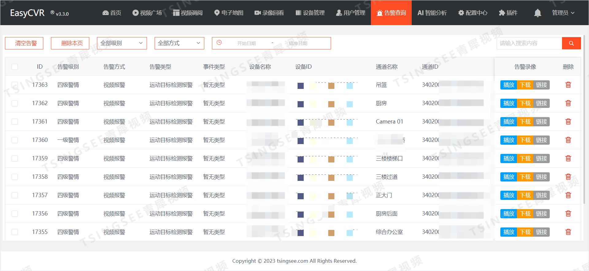 4、智能化分析与告警:实现对视频内容和结构化信息的智能分析,当设备检测到事先设定的特殊事件时,发送告警信息。平台可以接收设备上传的外部告警、视频信号丢失、离线、镜头遮挡和动态检测告警等信息,并记录告警状态与信息,并进行视频截取以获取告警时刻的截图。