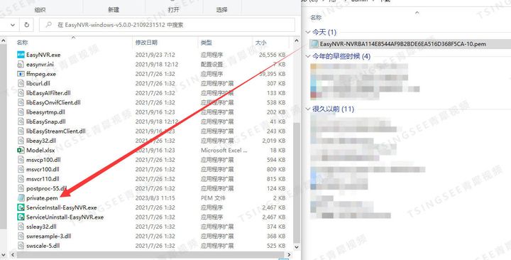 1)本地部署EasyNVR,将授权文件放到EasyNVR目录下,并将授权文件的名称改为private.pem,如下图: