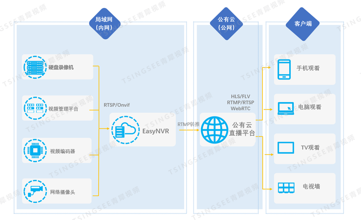 TSINGSEE青犀视频安防监控平台EasyNVR可支持设备通过RTSP/Onvif协议接入,并能对接入的视频流进行处理与多端分发,包括RTSP、RTMP、HTTP-FLV、WS-FLV、HLS、WebRTC等多种格式。在智慧安防等视频监控场景中,EasyNVR可提供视频实时监控直播、云端录像、云存储、录像检索与回看、告警等视频能力,极大满足行业的安防监控、无人值守等业务需求。