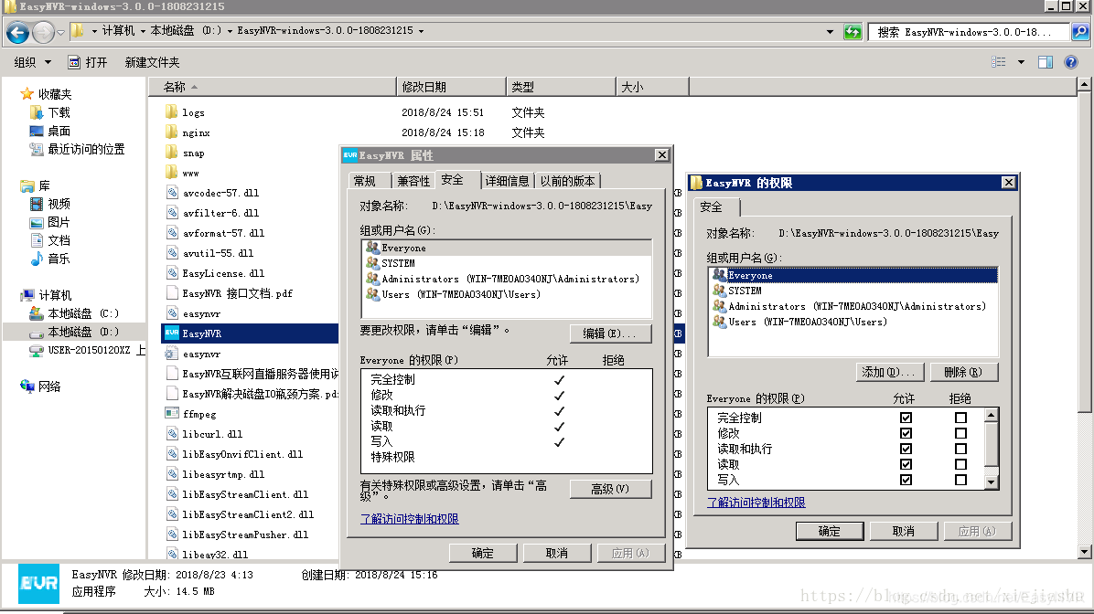 此问题也是我们之前没有遇到过的问题,我们尝试着通过添加exe可执行文件修改了用户权限(这里我们只是简单的把Everyone赋上了所有权限,正常运维过程中,系统服务应该是给Network Service这个用户赋上权限)如下图: