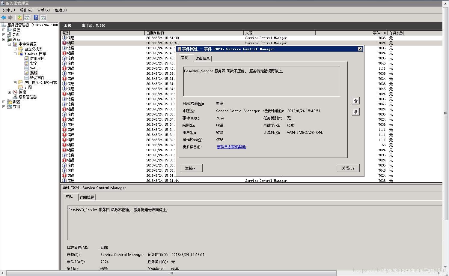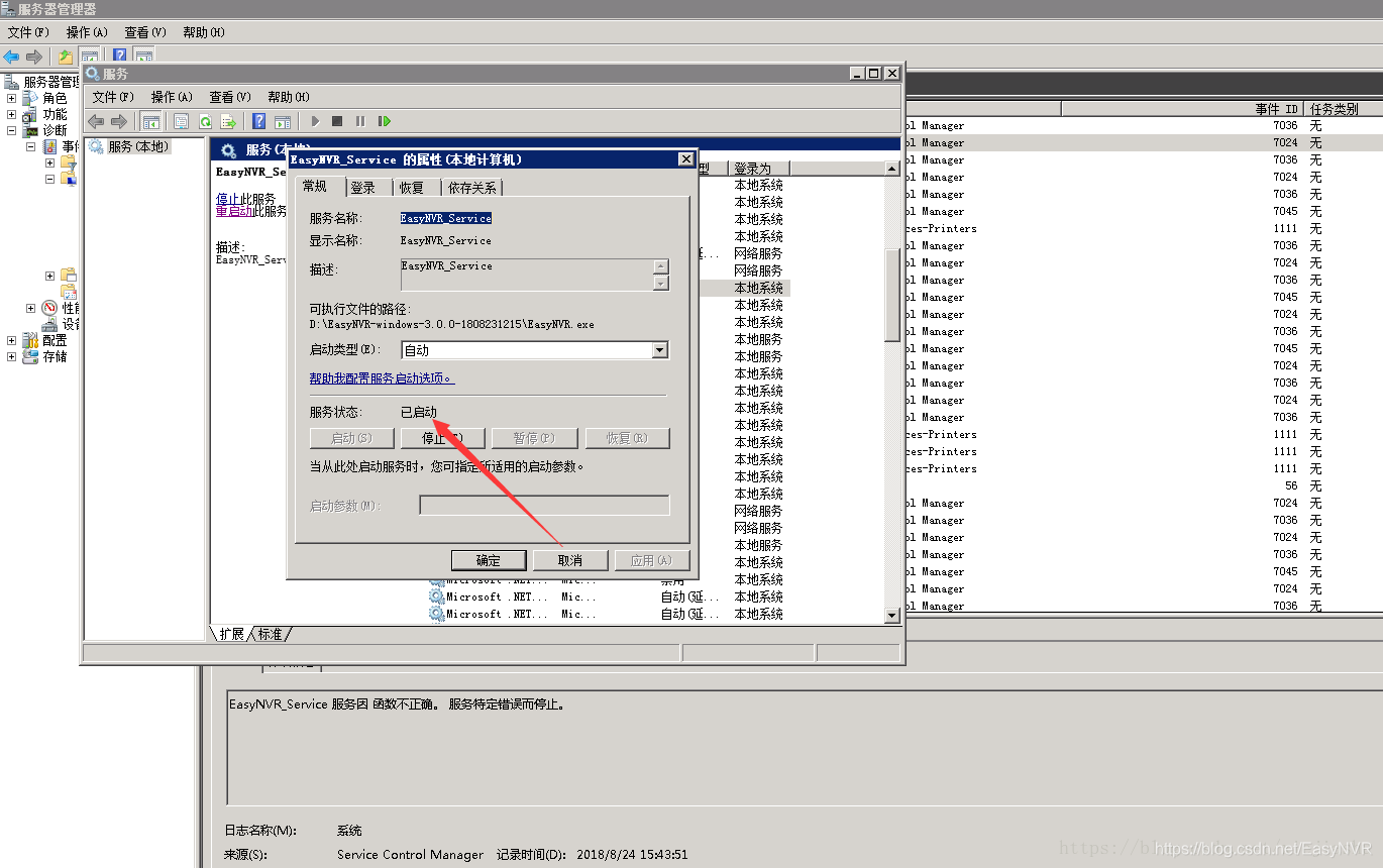 我们查看了windows系统日志,显示EasyNVRService服务因函数不正确,服务特定错误而停止。如下图: