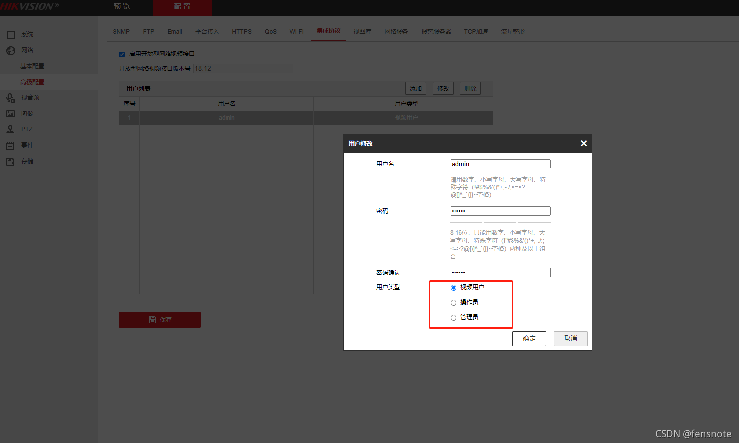 通过排查发现,原来是摄像头用户权限问题导致。摄像头并不是管理员的权限,需要在海康摄像头的后台页面进行修改,如下图: