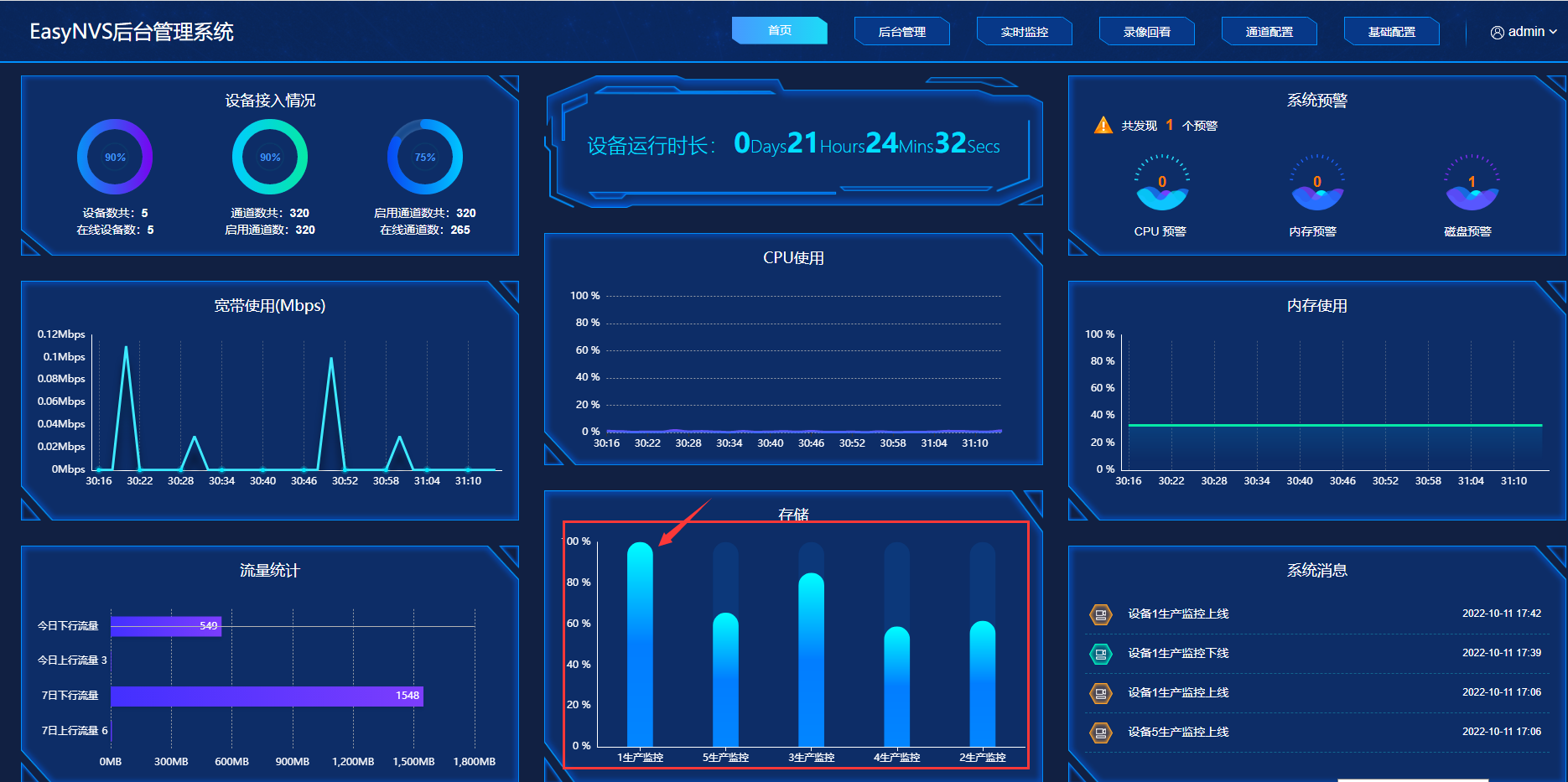 接到反馈后,技术人员立即进行了排查。查看EasyNVS页面首页,发现1生产车间的磁盘使用已达到100%,如下图: