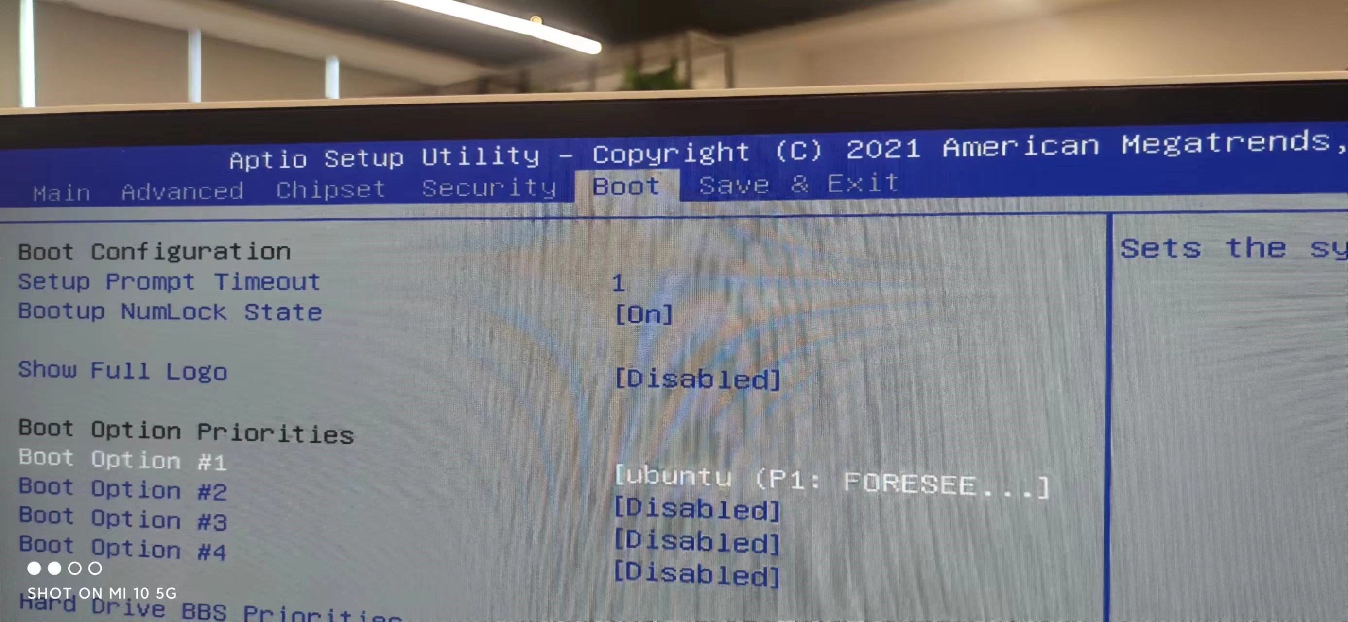 2)在boot内设置首启动项为ubuntu(如果没有该启动项,说明硬盘出现了问题,可以拆机重新插拔下硬盘或者返厂维修);