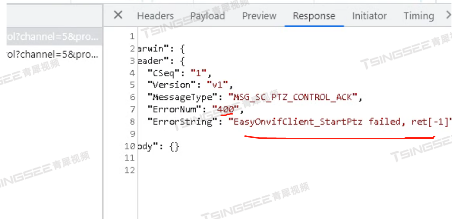 1)首先通过F12打开浏览器开发者工具,再点击云台操作,查看返回的接口有ret[-1]报错,如下图;