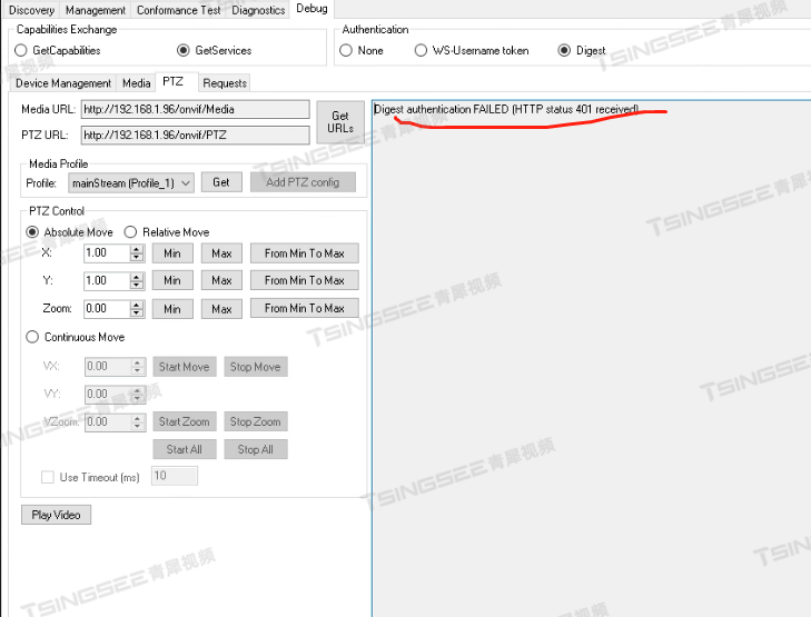 2)随后通过onvif工具测试,点击云台控制看到测试工具报401鉴权错误;