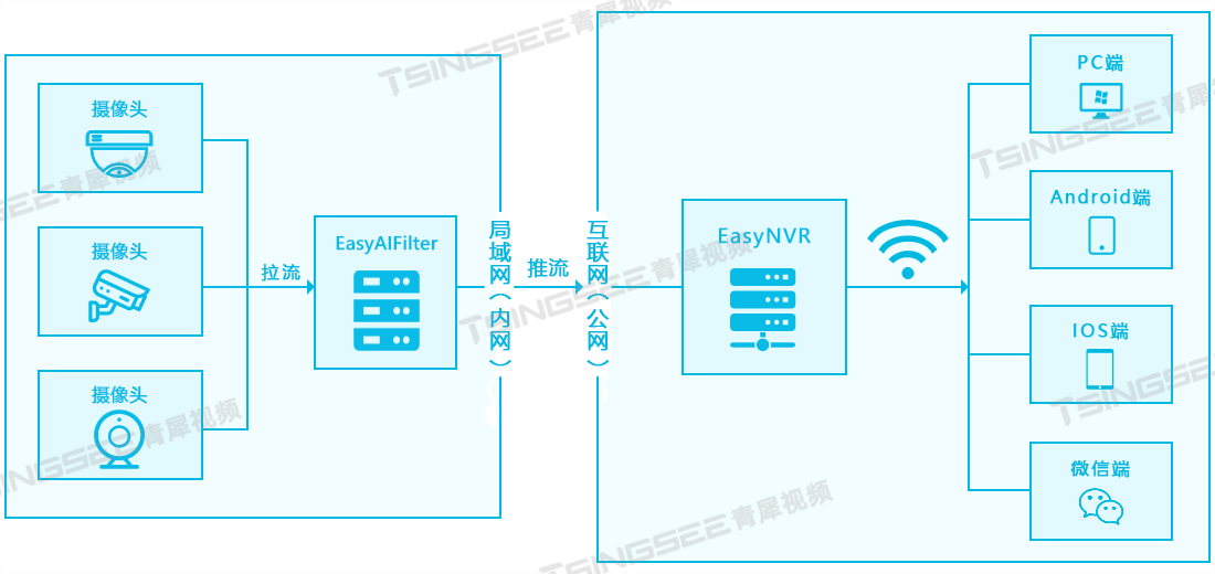TSINGSEE青犀视频安防监控平台EasyNVR可支持设备通过RTSP/Onvif协议接入,并能对接入的视频流进行处理与多端分发,包括RTSP、RTMP、HTTP-FLV、WS-FLV、HLS、WebRTC等多种格式。在智慧安防等视频监控场景中,EasyNVR可提供视频实时监控直播、云端录像、云存储、录像检索与回看、告警等视频能力,极大满足行业的安防监控、无人值守等业务需求。