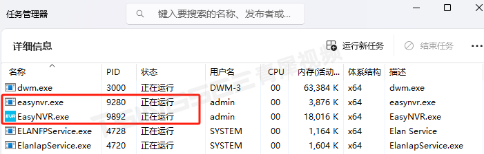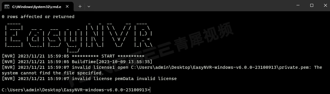 1)查看后台,发现没有EasyNVR相关进程。改用程序方式(EasyNVR.exe)启动,窗口打印“invalid license pemData invalid license”信息,即系统找不到有效许可文件。