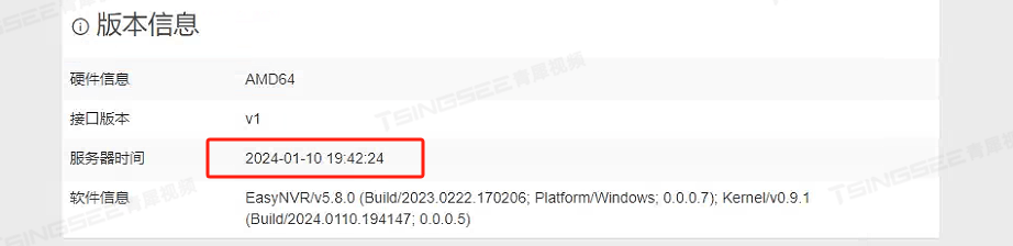 在确认平台版本、MD5和机器码一致后,可以从EasyNVR平台着手进行排查。我们尝试了两次对比验证:一是重新解压部署相同版本的EasyNVR;二是安装最新版本的EasyNVR,激活码授权均无效。当返回版本信息时,发现当前服务器时间并非实时时间,如下: