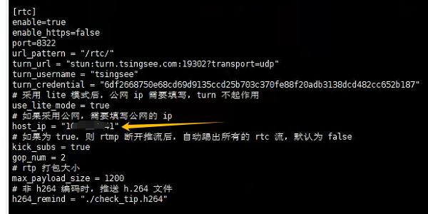 1)查看tsingsee.ini文件,当前RTC的收流地址也有配置,如下: