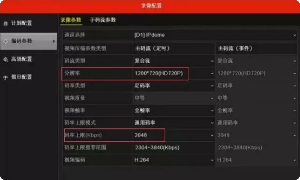 操作路径:主菜单—录像配置—编码参数,录像码流参数/子码流参数中将主/子码流的分辨率和码率上限降低;